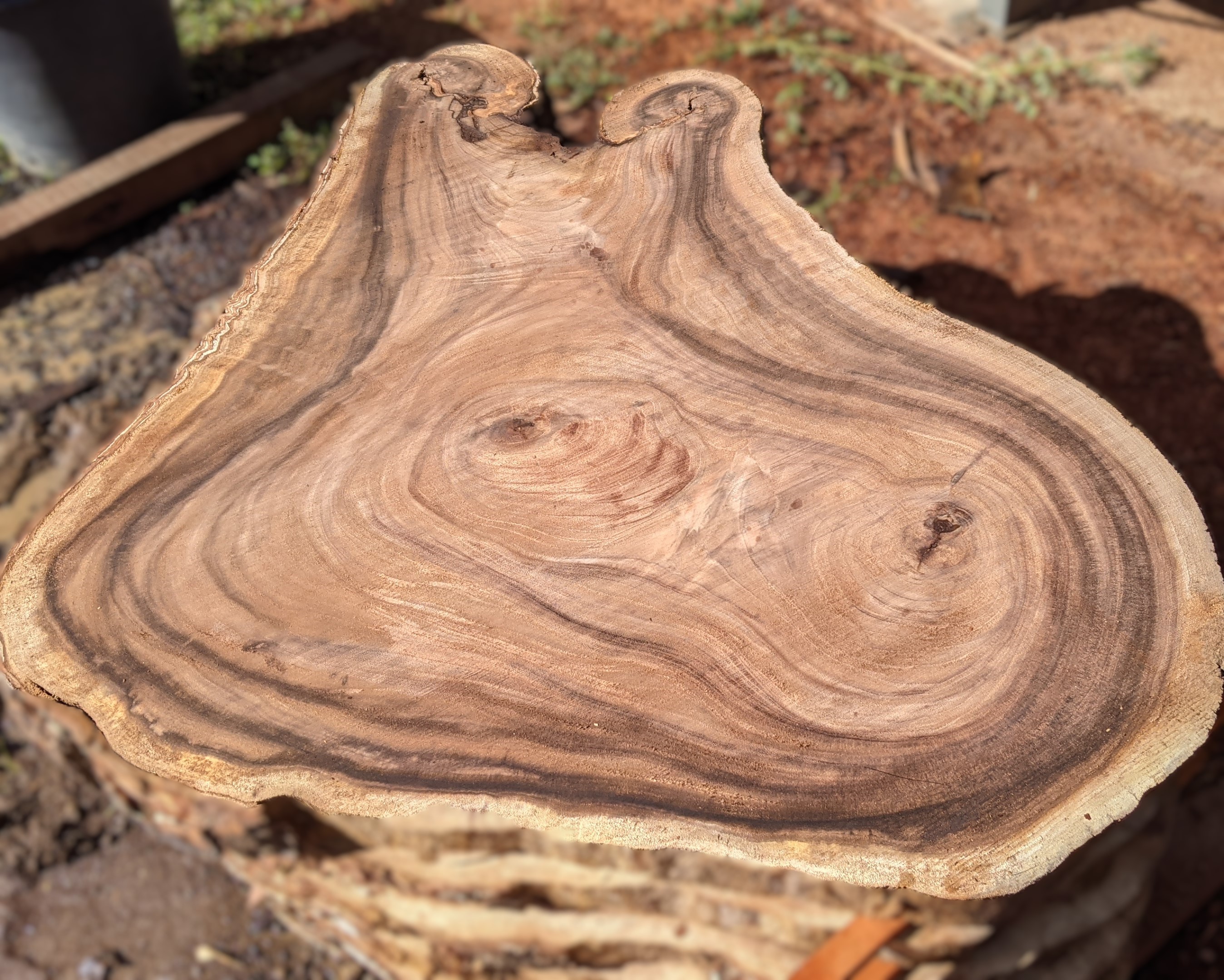 L’aubier peu épais est de couleur jaune, voire blanche. Le bois de cœur rouge présente des reflets dorés lorsqu’il est exposé au soleil. Les cernes de croissance sont indistincts. On constate que le grain est très fin et que le fil est souvent entrecroisé créant des figurations frisées.